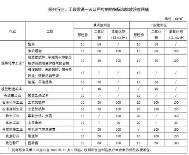 污染物排放限值調(diào)整:拋開之前設(shè)立的“第一時(shí)段”、“第二時(shí)段”、“第三時(shí)段”,新建和現(xiàn)有企業(yè)自11月起,直接實(shí)行原來“第四階段”污染物排放濃度限值。在行業(yè)細(xì)分上,相比原來的“火電廠、鋼鐵工業(yè)、煉焦化學(xué)工業(yè)、橡膠制造工業(yè)和合成革工業(yè)”,類別更豐富,增加了“石油化學(xué)工業(yè)、稀土工業(yè)和電池工業(yè)”等主要產(chǎn)業(yè),排放限值相比也有所降低。