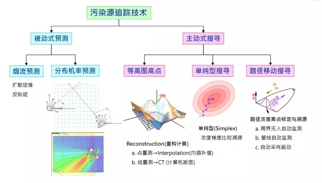 VOCs臭氣污染溯源技術是污染物濃度監(jiān)測結果的綜合應用,其原理是利用點監(jiān)測或線監(jiān)測設備的監(jiān)測結果,結合風向數(shù)據(jù),計算污染物在空間中的機率分布,或利用適當?shù)穆肪€規(guī)劃,移動量測位置以達到標定污染源位置的目的。綜合國內(nèi)外的技術發(fā)展現(xiàn)狀,污染溯源技術可大概分為被動式及主動式兩種(如下圖)。主動式搜尋方法較常見的有等高圖高點、單純型搜尋和路徑移動搜尋。被動式預測方法則包含煙流預測和分布幾率預測等方法。