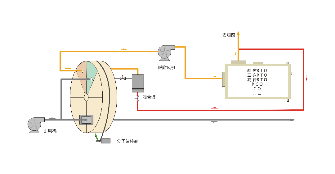 不同行業(yè)、不同工況條件下產(chǎn)生的VOCs組分不同,對(duì)處理方法也提出了不同的要求,根據(jù)組分性質(zhì)及工況條件的不同,對(duì)于大風(fēng)量(>10000m3/h)、低濃度低(<1000mg/m3)時(shí),適宜選用分子篩吸附濃縮轉(zhuǎn)輪+氧化單元組合處理工藝,能達(dá)到95%以上的VOCs去除率。